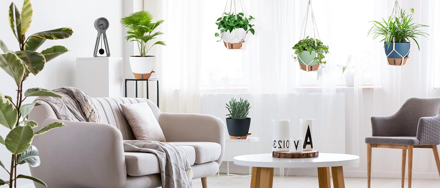 Hanging plant baskets in the living room bring tranquility and beauty to the space. They promote health through aromatherapy and help reduce stress by creating a calming, relaxing environment.