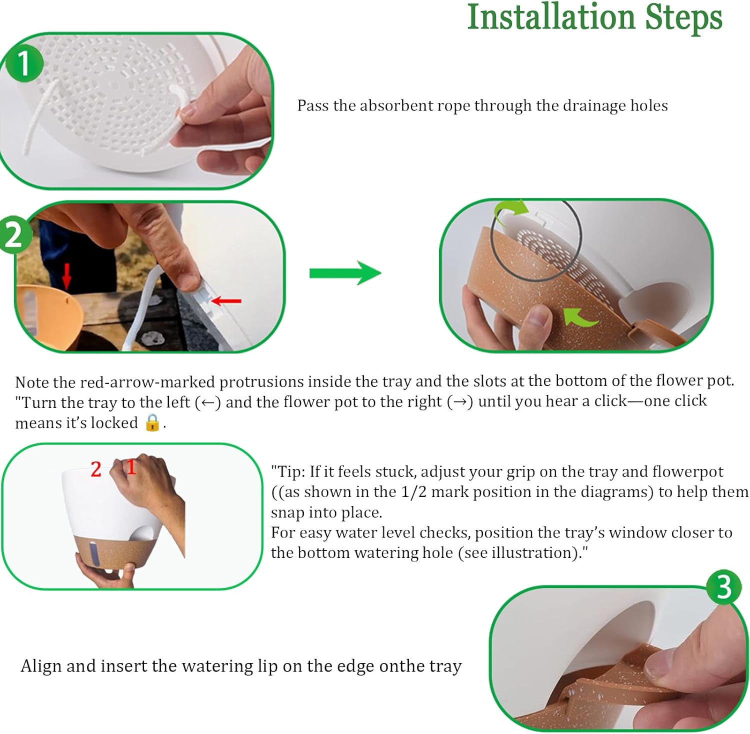 Our Quadruple Protection System: 1. Multiple drainage holes 2. Air circulation gap between pot/tray 3. Water level window prevents over/under-watering 4. Cotton wick auto-hydrates soil when dry. Perfectly balanced plant health!