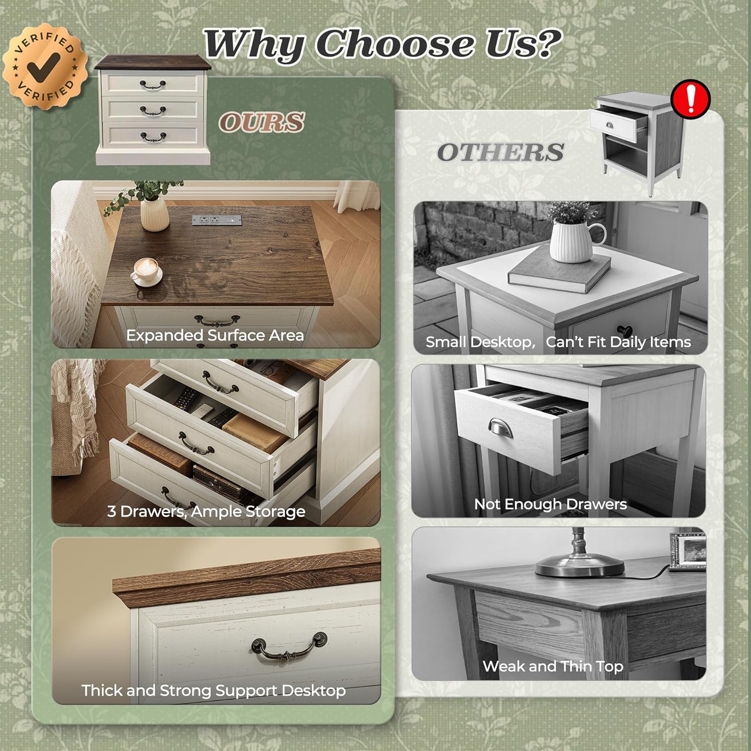 Huuger Nightstand with Charging Station, 3 Drawer Night Stand Set of 2, 22 Inch Wider Side Table with Storage, Farmhouse Nightstand with Vintage Handles, Thicken Base, for Bedroom, Distressed White