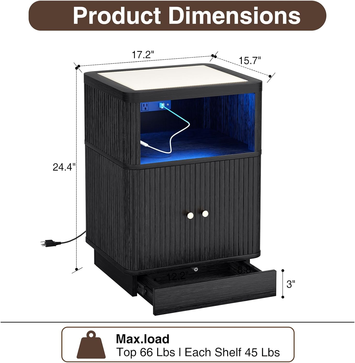 Night Stand with Charger Station, Modern Nightstand Set of 2 with Hidden Drawer, Saddle Leather Top, Smart LED, and Sliding Door Cabinet, for Bedroom, Living Room, Apartment, Dorm, Office, Black