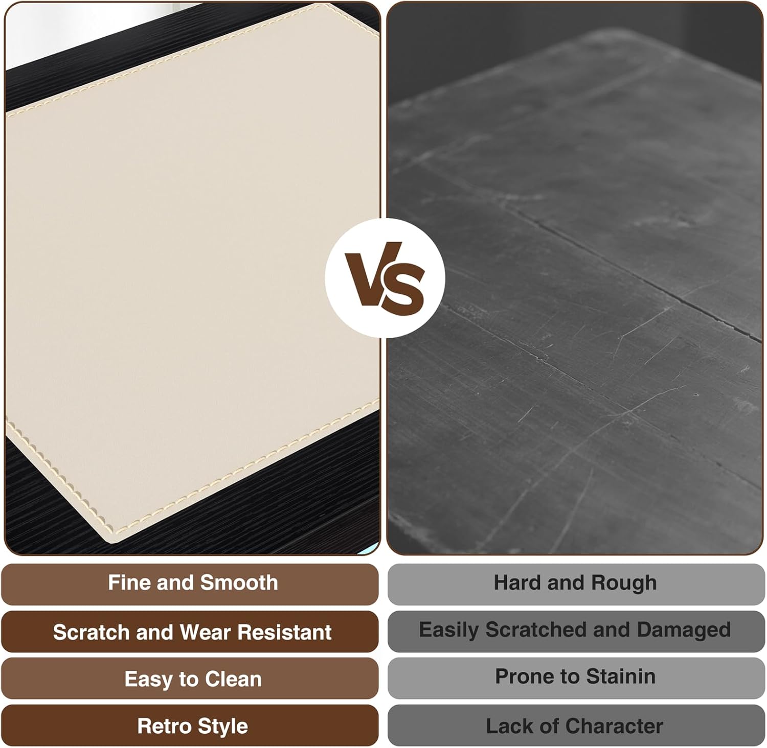 This bedroom nightstand features a saddle leather top, hidden drawer, sliding door cabinet, and curvy edge design for style and function.