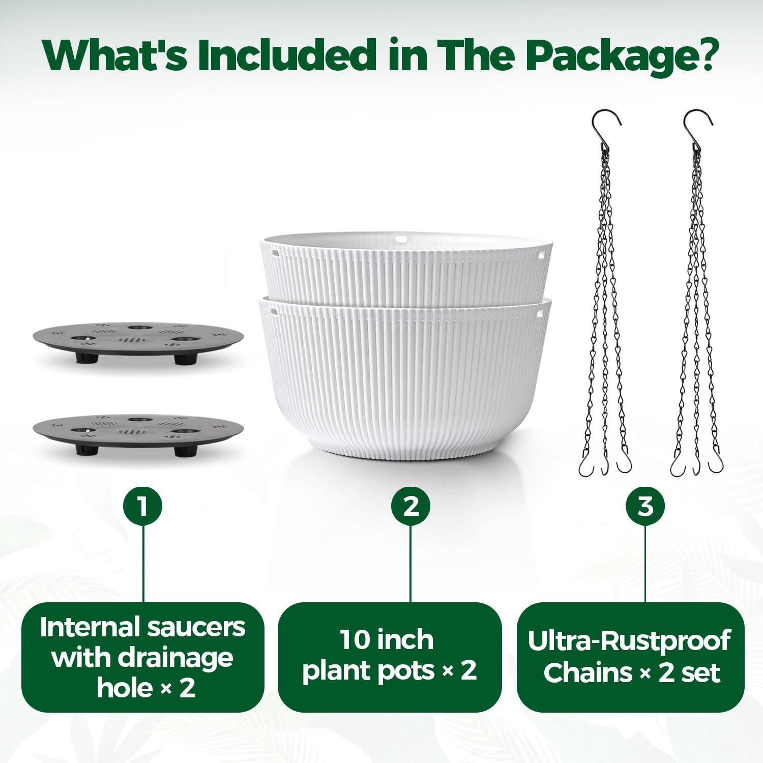 T4U 10 Inch Hanging Planters for Indoor Outdoor Plants, 2 Pack White Self Watering Hanging Plant Pot, Hanging Pots Set with Drainage Hole & Plug & Chain with 3 Hooks for Garden Home Decor